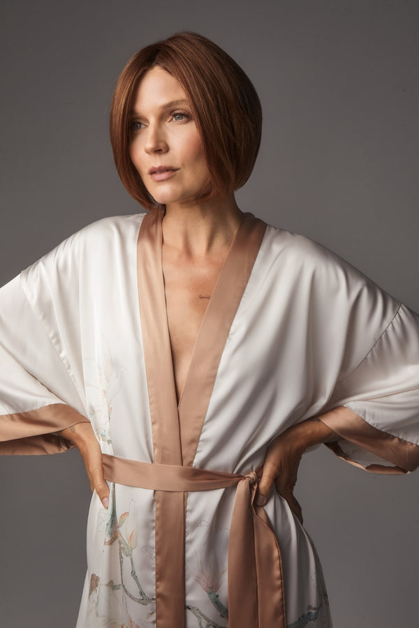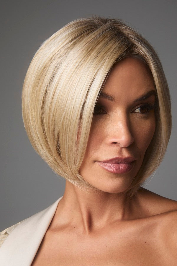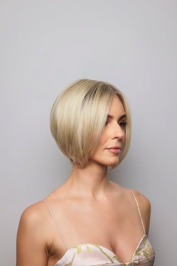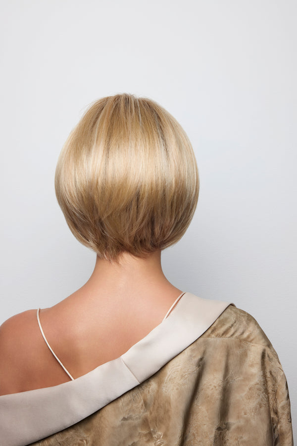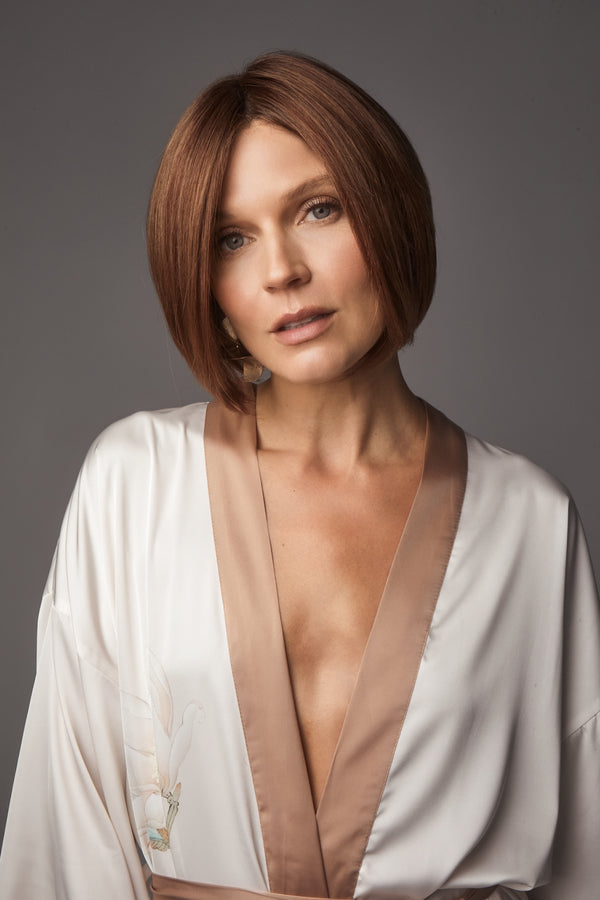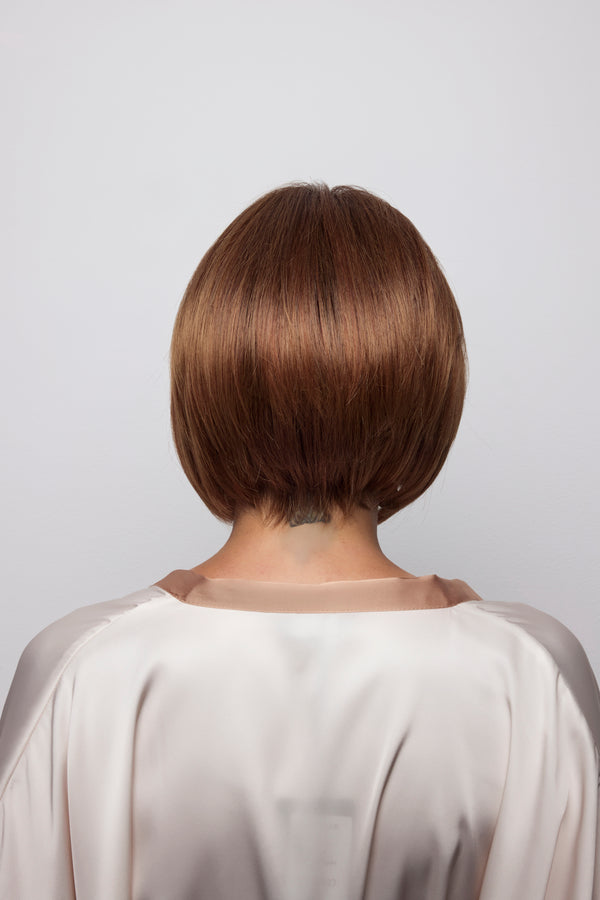 Ayumi from our Noriko Collection is a short-length blended fiber wig. This straight, ready-to-wear bob features a chic center part and a softly graduated shape that frames the neckline with elegance. Long, invisible face-framing layers and medium density create a polished yet versatile style, perfect for everyday wear or special occasions. Available in our NM (Natural Movement) fiber, a high-quality blend of synthetic and heat-friendly fibers that reduces shine while maintaining a natural look. Ayumi is designed with an extended lace front and soft lace part for a natural appearance, with adjustable tabs in the back-nape area for a secure and comfortable fit. The result is a stylish, natural-looking wig that is easy to wear.