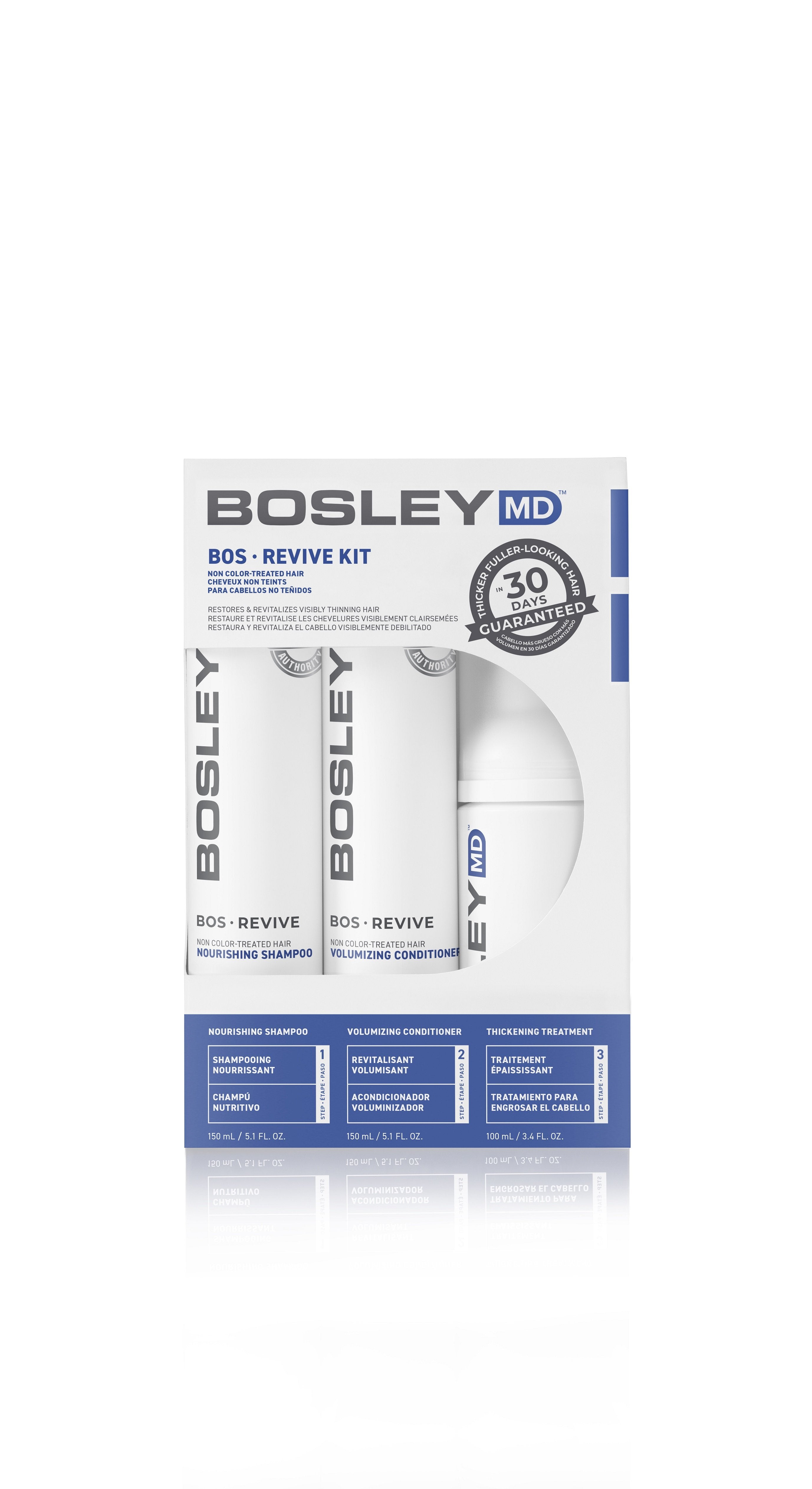 BosleyMD Revive Starter Pack For Non Color-Treated Hair is an all-in-one starter kit. It combines a nourishing shampoo, volumizing conditioner, and thickening treatment all in one pack.